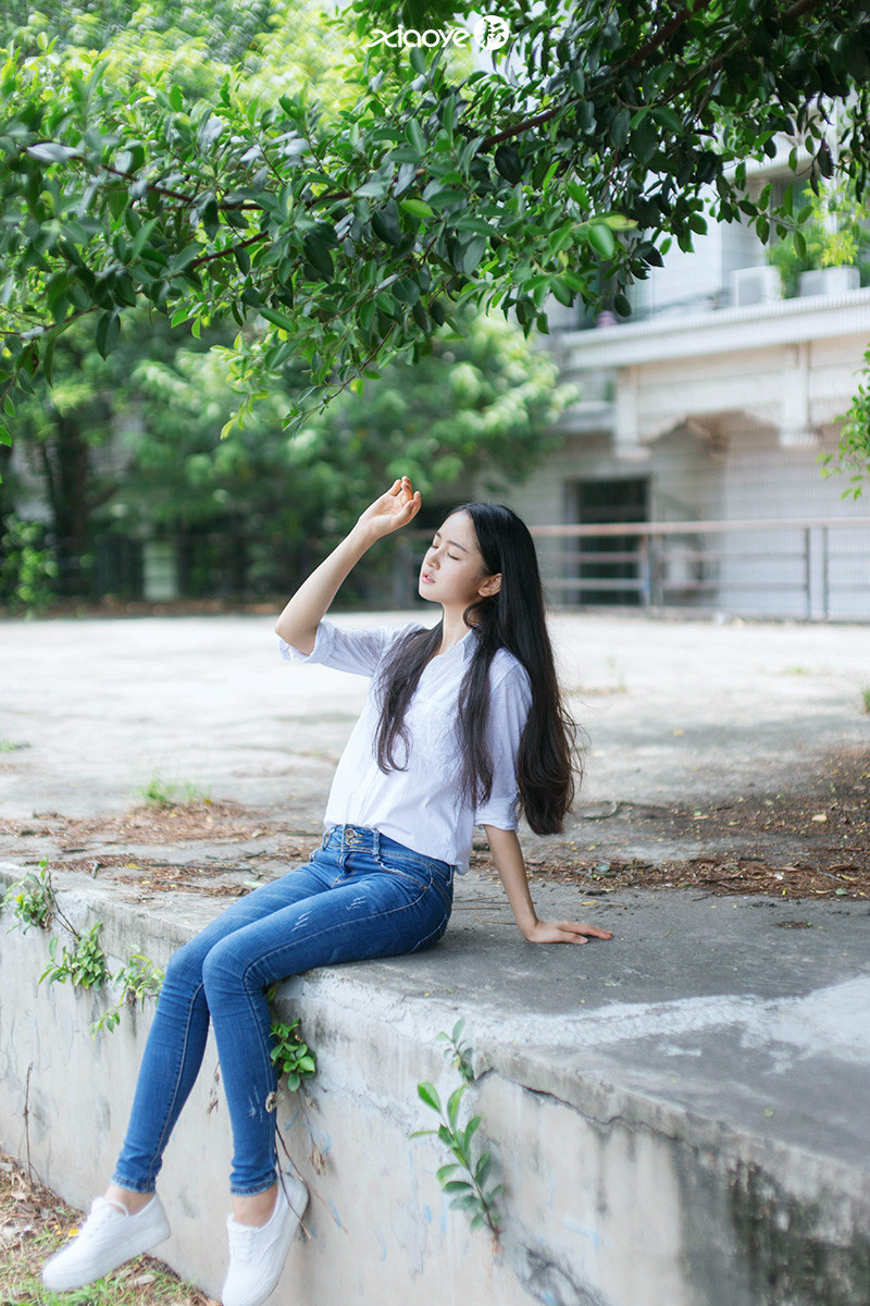 戶外牛仔褲長發(fā)文靜素顏女孩寫真