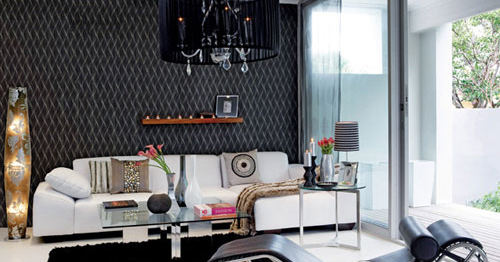 墻壁大面積使用黑底白紋的圖案,給地板留出足夠簡(jiǎn)潔的空間。沙發(fā)上方做出的原木架將發(fā)散的目光重新聚集,照片擺在一側(cè),圓扁的小蠟燭悄悄亮起,讓氣氛一下活躍起來(lái)。