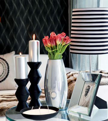搭配黑白兩色,最佳伴侶無(wú)外乎金屬與玻璃材質(zhì)。茶幾是玻璃的,燭臺(tái)是金屬的,雖然摩登,卻不免冰冷。于是點(diǎn)燃蠟燭,紅色郁金香簇?fù)矶,頓時(shí)讓人感到鮮活蓬勃的生機(jī),主人的照片靜靜擺放在一旁,也讓房間多了一絲溫暖。