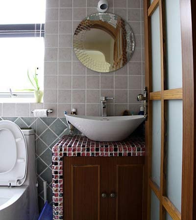 淘來(lái)的小鏡子,特價(jià)的洗臉盆,工人現(xiàn)場(chǎng)砌筑的浴柜。馬賽克有些貴,不過(guò)還是很漂亮的。馬桶是搞活動(dòng)的時(shí)候買(mǎi)的,好像是6折吧。墻磚是死纏爛打才算給了點(diǎn)點(diǎn)的折扣。