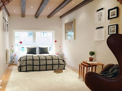 灰色、深藍(lán)色相間的格紋圖案床品配合空間整體輕柔的格調(diào),突出了臥室典雅的氣質(zhì)。純藍(lán)色的靠墊與其相呼應(yīng),有效地增添了房間的厚重感。