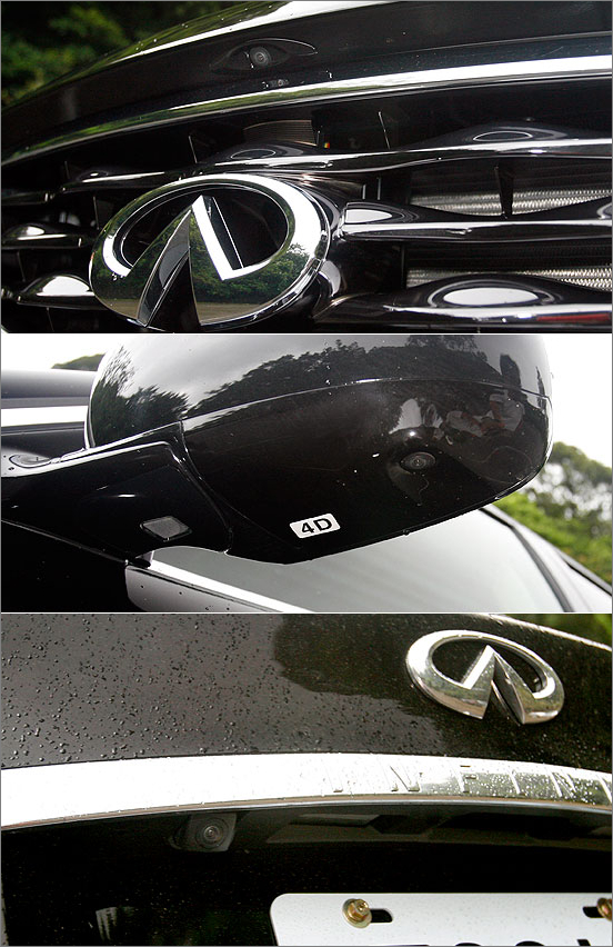 FX另一項(xiàng)吸引人的配備,則是首見於EX車系的AVM環(huán)景顯影系統(tǒng)。利用裝置於車身周圍的四組攝影鏡頭,并運(yùn)用影像合成技術(shù),AVM系統(tǒng)可提供360度的鳥瞰輔助影像。 FX另一項(xiàng)吸引人的配備,則是首見於EX車系的AVM環(huán)景顯影系統(tǒng)。利用裝置於車身周圍的四組攝影鏡頭,并運(yùn)用影像合成技術(shù),AVM系統(tǒng)可提供360度的鳥瞰輔助影像,顯示於彩色螢?zāi)挥疫厖^(qū)塊;左邊較大區(qū)塊則顯示車尾或車頭影像,駕駛并可視所需切換顯示右側(cè)影像,以減少視覺死角。