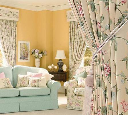 搭配點評:米色玫瑰花圖案的窗簾,圖案以花藤為主,感覺清新淡雅。搭配同色系的墻面顏色和淡藍(lán)色以及窗簾同款布藝的沙發(fā)非常和諧。