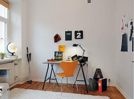 橙色的座椅加上輕便實用的工作臺,立刻營造出一處休閑辦公的區(qū)域,鮮艷明快的色彩和空間感讓人感覺舒適又愜意。