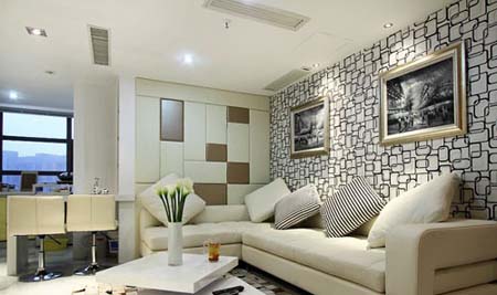 進門就是客廳感覺非常開敞,淺色調明亮時尚;客廳的右邊是餐廳和廚房,開放式的設計時尚休閑;客廳的電視墻是有弧形的墻面,墻后便是臥室;電視墻的打造也算簡單,只是加裝了一款黑白幾何的裝飾板就搞定了,時尚個性也相當省錢。