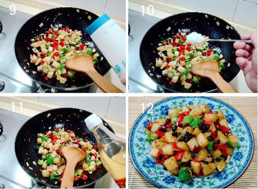 7、把小料炒香后倒入土豆丁煸炒均勻; 8、然后倒入青紅辣椒煸炒; 9、用味精和鹽調(diào)味; 10、再撒入適量白糖炒勻; 11、出鍋前淋入適量白米醋炒勻,然后便可出鍋; 12、出鍋碼盤便可上桌食用。