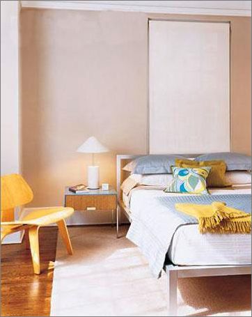 4.個空間給人的整體感覺是干凈而簡練,伴隨一些陽光的味道。溫暖陽光味道來自與暖黃色的床單,這與橘黃色條紋的窗簾相呼應。而墻上那純凈到令人窒息的藍,讓再煩躁的心情在此刻沉淀。