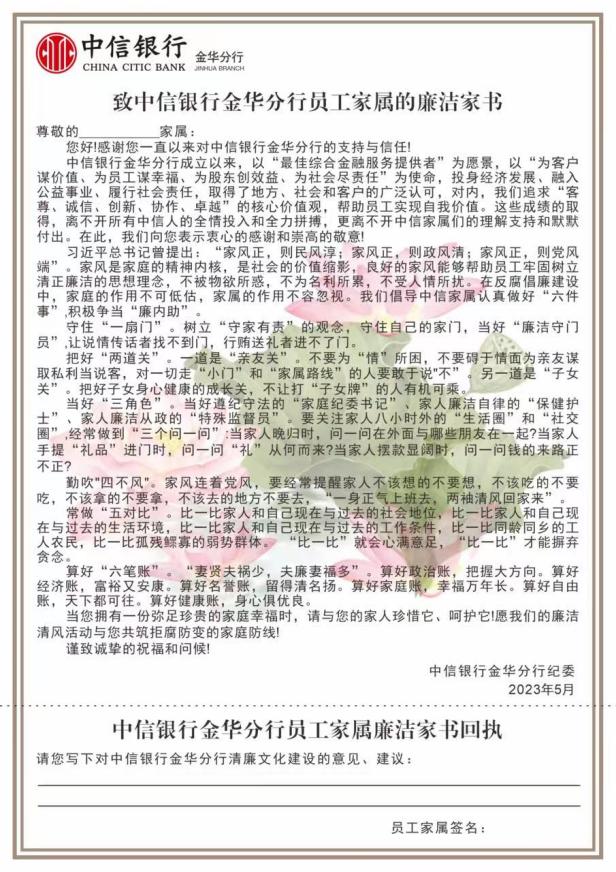 忠厚傳家久,家書(shū)抵萬(wàn)金。為深入推進(jìn)清廉文化建設(shè),結(jié)合該行“精思細(xì)悟?qū)W思想 爭(zhēng)先進(jìn)位建新功”主題活動(dòng),以良好家風(fēng)涵養(yǎng)廉潔文化,引導(dǎo)干部員工修身律己、廉潔齊家,5月26日,中信銀行金華分行把黨性教育與家風(fēng)教育結(jié)合起來(lái),向每一名員工寄出一封廉潔家書(shū),通過(guò)家書(shū)寄清廉,紙短“廉”長(zhǎng)送清風(fēng)。 習(xí)近平總書(shū)記曾提出:“家風(fēng)正,則民風(fēng)淳;家風(fēng)正,則政風(fēng)清;家風(fēng)正,則黨風(fēng)端”。家風(fēng)是家庭的精神內(nèi)核,是社會(huì)的價(jià)值縮影,良好的家風(fēng)能夠幫助員工牢固樹(shù)立清正廉潔的思想理念,不被物欲所惑,不為名利所累,不受人情所擾。在反腐倡廉建設(shè)中,家庭的作用不可低估,家屬的作用不容忽視。 該行在家書(shū)中,感謝員工及其家人直以來(lái)對(duì)中信銀行金華分行的支持與信任,同時(shí)倡導(dǎo)中信家屬積極爭(zhēng)當(dāng)“廉內(nèi)助”,認(rèn)真做好“六件事”:即守住“一扇門(mén)”、把好親友、子女“兩道關(guān)”,當(dāng)好“家庭紀(jì)委書(shū)記”、家人自律的“保健護(hù)士”、家人從業(yè)的“特殊監(jiān)督員”“三角色”。勤吹不該想的不要想,不該吃的不要吃,不該拿的不要拿,不該去的地方不要去“四不風(fēng)”,常做“五對(duì)比”,算好政治、經(jīng)濟(jì)、名譽(yù)、家庭、自由、健康“六筆賬”。 此次廉潔家書(shū)活動(dòng),還是一次紙短“廉”長(zhǎng)的清風(fēng)活動(dòng),通過(guò)信件下方的回執(zhí)小紙片,廣泛收集員工家屬對(duì)中信銀行金華分行清廉文化建設(shè)的意見(jiàn)建議,集員工和家屬的力量,共同做好清廉文化建設(shè)。 通過(guò)開(kāi)展該項(xiàng)活動(dòng),充分拉近了員工家屬與單位的距離,增進(jìn)了家庭內(nèi)部的溫情,為干部員工構(gòu)筑起一道堅(jiān)固的反腐倡廉“家庭防線”。該行員工紛紛表示:廉潔,是最重要的家風(fēng);清廉,是送給家人最好的禮物。 |