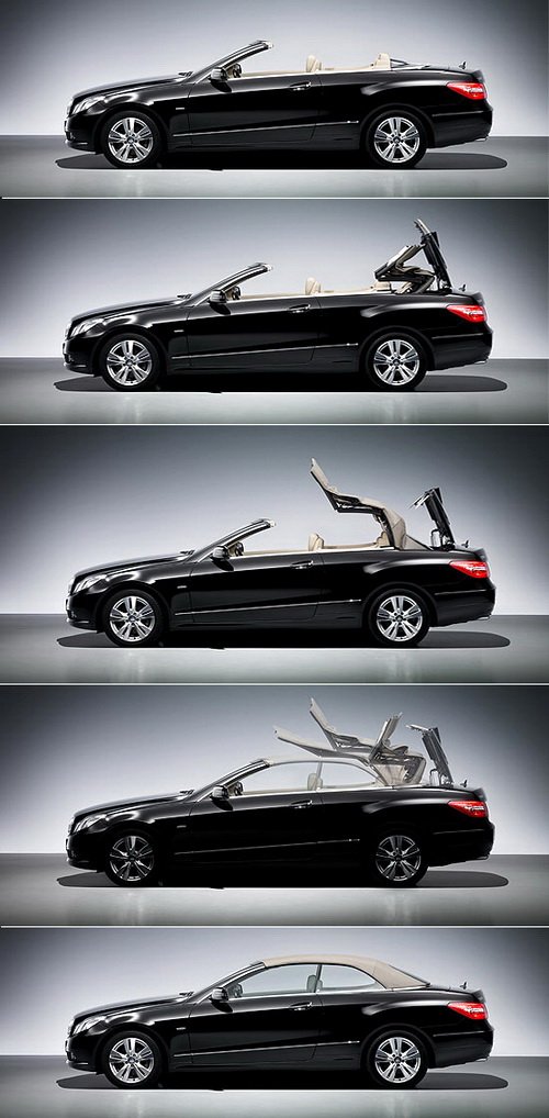 而在旗下車系眾多的Mercedes-Benz方面,則是一直維持著硬頂與軟頂敞篷并存的雙軌規(guī)劃,例如純雙座設定的SLK及SL,由于不用擔心后座空間的問題,所以便采用硬頂敞蓬設計,而像已停產(chǎn)的2+2座敞篷車CLK Cabriolet,則是采軟篷設計,以提供較充裕的室內乘坐及行李箱空間;所以在這款E-Class家族最新敞篷車成員:E-Class Cabriolet上,在考慮至少得提供基本4座配置,以及足夠的行李箱空間后,原廠不僅保留了前代車款的軟頂敞篷設定,也賦予了它一身優(yōu)雅。 ● 二十秒變身 輕松轉換心情由于在目前Mercedes-Benz的策略中,已逐步開始簡化車系,以C-Class、E-Class、S-Class為核心來擴張旗下車型,所以在目前E-Class家族中,已衍生出E-Class四門房車、E-Class Coupe雙門跑車、E-Class Estate五門旅行車與E-Class Cabriolet雙門敞篷車。