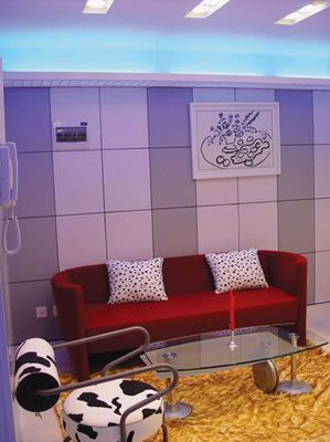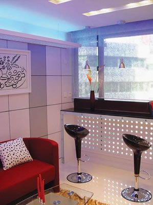 設(shè)計(jì)師選擇了玫紅色圓形小地氈配上純白色與沙發(fā)邊落地?zé)粼煨拖嘟男〔鑾,?dāng)然,相同枚紅色的沙發(fā)靠墊和抱枕也成為適合的點(diǎn)綴。