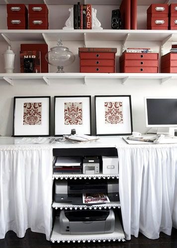 利用起居室的一面墻,就可創(chuàng)造出一個(gè)節(jié)省空間的辦公區(qū)域。幾塊隔板、一張緊靠墻的長(zhǎng)書(shū)桌,白色的裙擺桌圍不僅舒緩了辦公區(qū)慣有的緊迫感,而且還能巧妙地遮掩住收納于桌下的雜物。 |