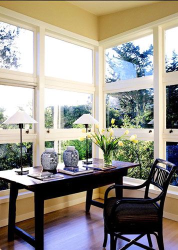 簡約的中式風(fēng)格,黑檀色的家具盡顯成熟穩(wěn)重的雅士之風(fēng)。兩面玻璃墻全景展現(xiàn)室外山林之美。很恬靜的書香味似乎就彌漫在這古色古香的書桌椅之間。