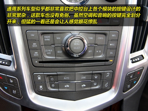 通用系列的車型似乎都喜歡把中控臺(tái)上各個(gè)模塊的按鍵設(shè)計(jì)的非常繁復(fù),這款SRX也沒(méi)能免俗。雖然空調(diào)和音響的控制按鍵被完全的分開(kāi)來(lái)設(shè)置,但猛的一看還是會(huì)讓人感覺(jué)眼花繚亂。