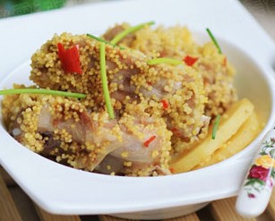 排骨400克、小米50克、小土豆一個、白糖3克、鹽5克、生抽20克、料酒10克、蠔油10克、辣椒醬15克。