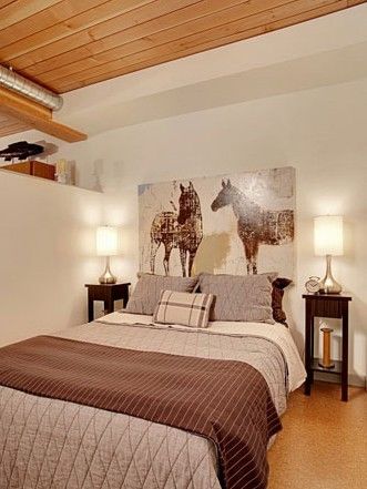 在這間不大的臥室里,濃郁的自然風(fēng)情包圍著身心,造型樸素的邊柜木色較深,增加了空間的色彩變化;搭配上一幅印染的馬匹裝飾畫,昭示著臥室鮮明的個性