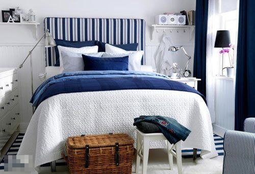 藍(lán)白兩色的臥室,純凈至極。身心也在此刻得到徹底的放松。臥室里的直線造型,既現(xiàn)代又明朗,但可以用軟包的床體和自然的協(xié)調(diào)色系,弱化線條的硬朗。 |
