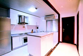 鮮艷的紅白兩色在所到之處以不同的方式自由調(diào)和,無論是左側(cè)墻面上的精巧的展示柜,還是原木色的簡(jiǎn)單桌椅,亦或是右側(cè)造型獨(dú)特的燈柱狀玄關(guān),徹底驅(qū)逐了傳統(tǒng)廚房的沉悶,處處洋溢著耀眼的光芒和躍動(dòng)的色彩……