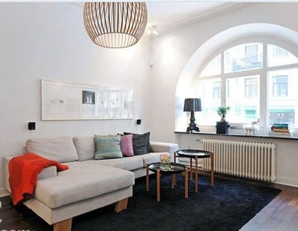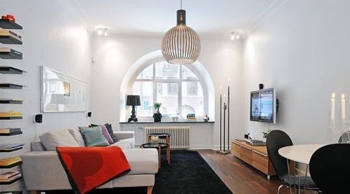 這個(gè)小戶型的客廳可謂是一個(gè)高效空間,它兼具了閱讀區(qū),就餐區(qū)和視聽區(qū)三個(gè)功能。為了獲得更多的使用空間,電視機(jī)采用壁掛的形式,下面簡(jiǎn)潔的木質(zhì)矮柜用來(lái)放置常用影音設(shè)備和雜物。