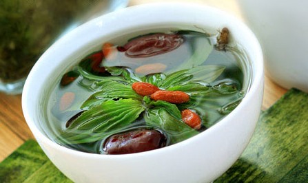 枸杞大棗車前草湯,是一道非常好的清熱解毒養(yǎng)肝滋陰湯。車前草全身都是寶,其性味甘寒無毒,清熱利尿,祛痰止咳,清肝明目!侗静菥V目》認為:久服輕身耐老。車前草有降血壓,治療急性肝炎和急慢性支氣管炎等功效。根據(jù)藥理實驗,車前草內舍車前甙、熊果酸、維生素c、維生素B成份。與大棗枸杞配伍,既能相得益彰,也能相互作用,可以起到清熱利尿、養(yǎng)肝滋陰益腎的作用。 車前草,生于田野畦畔山埔路旁,越是踐踏生命越是頑強,而那些肥沃的很少有人經過的地方,是找不到它的蹤跡的。車前草葉全部根生,葉片平滑,主脈五條,向葉背凸起。秋天抽穗結子,就是非常有名的車前子咯。車前草是一種味道鮮美的野菜,全身都可以食用,用它煎湯煮茶,沒有毒副作用。