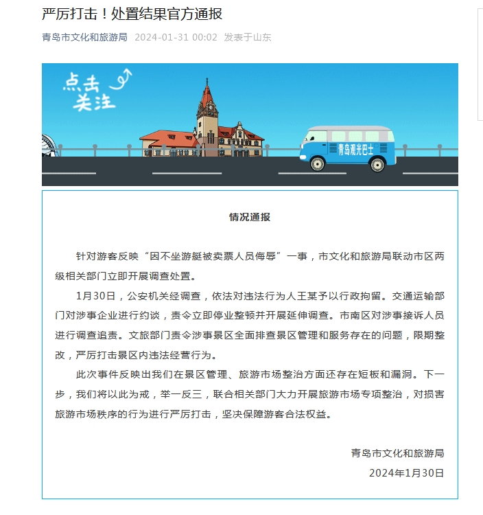 據(jù)青島市文化和旅游局官方微信消息,針對游客反映“因不坐游艇被賣票人員侮辱”一事,青島市文化和旅游局聯(lián)動市區(qū)兩級相關(guān)部門立即開展調(diào)查處置。 1月30日,公安機關(guān)經(jīng)調(diào)查,依法對違法行為人王某予以行政拘留。交通運輸部門對涉事企業(yè)進行約談,責(zé)令立即停業(yè)整頓并開展延伸調(diào)查。市南區(qū)對涉事接訴人員進行調(diào)查追責(zé)。文旅部門責(zé)令涉事景區(qū)全面排查景區(qū)管理和服務(wù)存在的問題,限期整改,嚴厲打擊景區(qū)內(nèi)違法經(jīng)營行為。 ![]() 圖片來源:青島市文化和旅游局官方微信 |