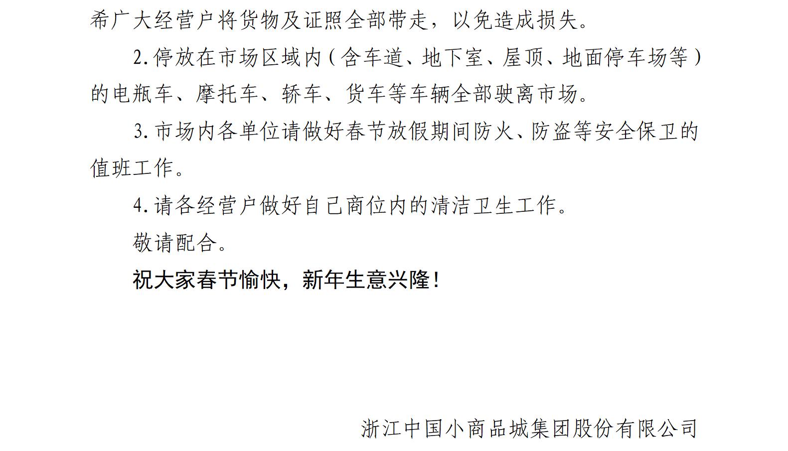 國(guó)際陸港集團(tuán)提醒,各經(jīng)營(yíng)戶鎖好門窗,妥善保管好各自經(jīng)營(yíng)場(chǎng)地內(nèi)的貴重貨物及重要證照,避免不必要損失;做到“人走斷電”,確保消防安全,謹(jǐn)防火災(zāi);做好經(jīng)營(yíng)場(chǎng)地內(nèi)的清潔衛(wèi)生工作。 |