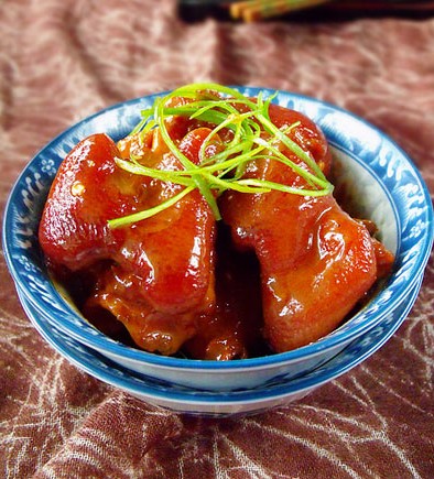 原料:豬蹄、腐乳、蔥、姜、干辣椒、鹽、冰糖、白酒、五香粉、雞精、香油、生抽。 做法: 1、原料圖; 2、豬蹄焯水,水里放一塊拍碎的姜,水開放兩湯勺白酒。再次煮沸(這是處理豬肉類的常規(guī)方式,白酒比料酒更能提香,我家常備一小瓶白酒); 3、豬蹄過冷水洗干凈; 4、蔥切馬蹄狀,姜切片,紅辣椒切段,腐乳四小塊加點(diǎn)腐乳汁攪碎; 5、鍋里放油,小火把豬蹄煸炒微黃,多余的油倒出去(夏天怕油大炒微黃可以去豬肉的油,然后倒出去多余的油,減少油膩,豬油可以用來炒素菜,很香),放入三四顆冰糖炒一會; 6、放入蔥姜干辣椒炒出香味,倒入腐乳汁,五香粉一茶匙炒勻; 7、兌水淹沒豬蹄,放一湯匙生抽,半茶匙鹽。大火燒開,小火燉一小時半; 8、放半茶匙鹽,大火收汁,收干了才會有紅紅的顏色哦!最后淋點(diǎn)香油提香,放點(diǎn)雞精或者味精翻勻即可; 9、裝盤用細(xì)蔥絲裝飾,要是有香菜更好。 |