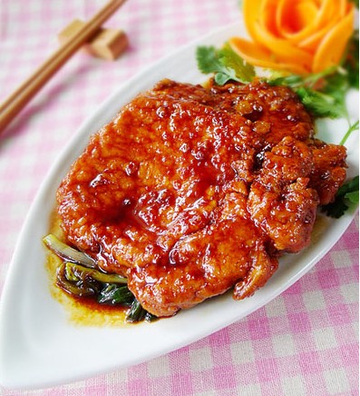 7、熱油把大排炸定型。鎖住里面的水分不流失,就不會干。不要太焦,定型就可以了; 8、炸好的大排; 9、鍋里的油全部倒掉,鋪上蔥,煎一下,放上大排蓋上蓋子,最小火燜一分鐘,是最小火; 10、兌上碗里的料汁。大火滾開,中火煮倒湯汁濃郁即可。中間翻身一次; 11、湯汁收干即可。 |