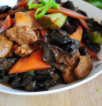 4、炒鍋洗干凈,重新置于火上,倒入少許油,放入蔥段、姜片煸炒出味,然后依次放入胡蘿卜片、木耳、尖椒翻炒,添適量水,蓋鍋蓋燜燒五分鐘后倒入豬肝,加生抽、老抽、少許鹽、雞精,翻炒均勻即可。