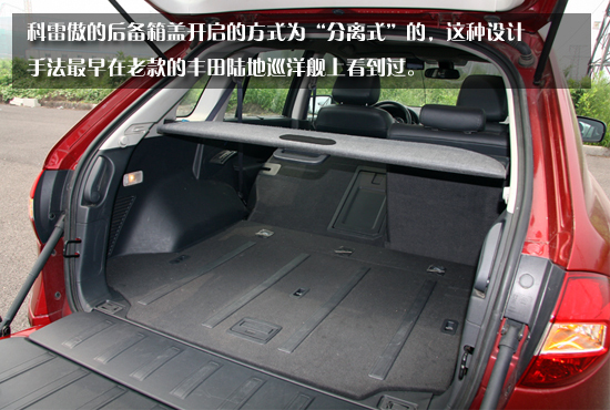 科雷傲的后備箱完全可以用巨大來(lái)形容,在后排座椅不放到的情況下,其后備箱的容積有450升,而將后排座椅完全放到之后可以猛增至1380升?评装恋暮髠湎渖w開啟的方式為“分離式”的,這種設(shè)計(jì)手法最早在老款的豐田陸地巡洋艦上看到過(guò)。