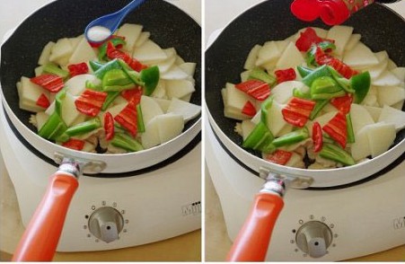3、炒至雞片變色,放入沙葛; 4、翻炒3分鐘左右,放入青紅椒和蔥段; 5、繼續(xù)翻炒1分鐘,加入少許鹽和糖; 6、倒入海鮮醬油,翻炒均勻即可。