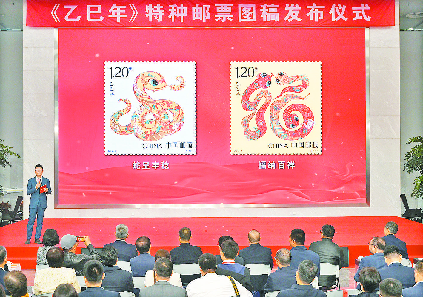 10月30日在發(fā)布會(huì)現(xiàn)場(chǎng)展示的郵票圖稿。 當(dāng)日,中國郵政《乙巳年》特種郵票圖稿發(fā)布儀式在北京舉行。發(fā)布儀式上公布了《乙巳年》特種郵票即蛇年生肖郵票圖稿并揭幕中國郵政攜手港、澳郵政部門共同印制的《乙巳年》生肖同題材三地小全張。 《乙巳年》特種郵票一套兩枚,郵票圖名分別為“蛇呈豐稔”和“福納百祥”,以敦煌壁畫和傳統(tǒng)民俗為靈感來源,將蛇的形象與吉祥寓意巧妙結(jié)合,既體現(xiàn)了生肖文化的獨(dú)特魅力,又凝聚了樸素靈活的民間智慧。 據(jù)悉,《乙巳年》特種郵票將于2025年1月5日正式上市發(fā)售。 |