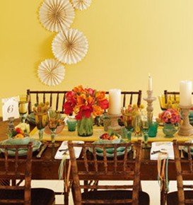 設(shè)計(jì)者:bhldn 婚禮策劃:easton events 色彩方案:鸚鵡郁金香放在藍(lán)綠色系Mason花器中,搭配田園感濃烈的桌椅,制造復(fù)古氣息。 桌布選擇:黃白間隔條紋桌旗,增加整體時(shí)尚感。 打造亮點(diǎn): 1. 墻上裝飾的折紙。 2. 多彩絲帶系在名卡上,同時(shí)一枚復(fù)古銅鑰匙作為回禮。 3. 琥珀色花器增添復(fù)古感。 4. 荷葉邊餐盤營(yíng)造質(zhì)樸的手工復(fù)古感。
