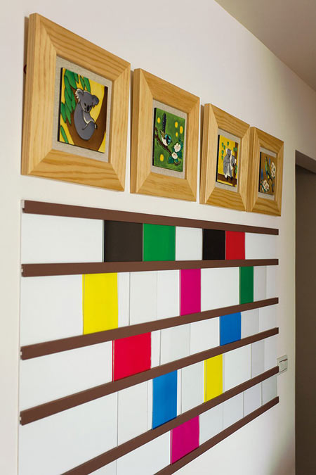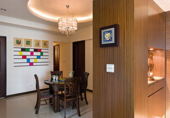 廚房以白色系統(tǒng)柜搭構(gòu)而成,設(shè)計師將塬本開門換成拉門與餐廳相隔,有效阻擋油煙也能保持視覺的穿透感。餐廳的餐柜選用銀貂木作,以溝縫和線條作出造型,圓型的天花板唿應(yīng)圓型餐桌,再搭配優(yōu)雅的水晶吊燈,營造氣質(zhì)取勝的用餐氛圍;餐廳墻面掛上屋主收藏的四幅畫作外,設(shè)計師以木條勾勒出排列相片的相框邊框,特殊的造型吸引目光,這是設(shè)計師獻(xiàn)給屋主獨一無二的精緻作品。書房內(nèi)雙層的書柜設(shè)計以軌道方式輕推即可移動位置,找到想看的書籍;L型的書桌可容納一家四口一同閱讀,增進(jìn)親子關(guān)係。