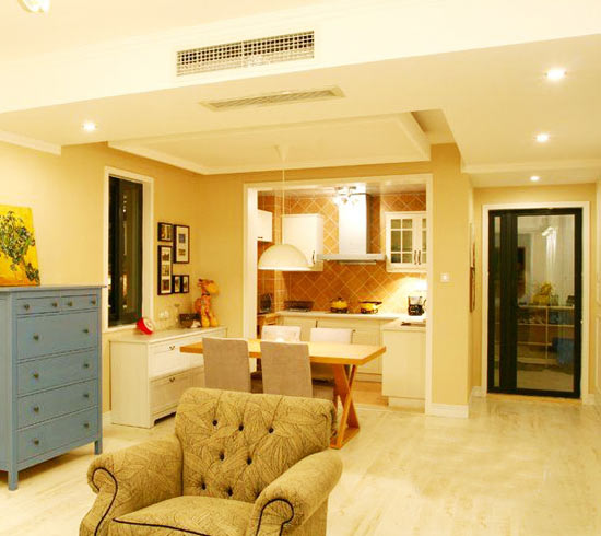 充滿北歐風情的淺棕色布藝沙發(fā)在黃色燈光下顯得格外協(xié)調(diào),客廳一角就可以窺見一體化的餐廳和廚房,房間設(shè)計精致且實用。