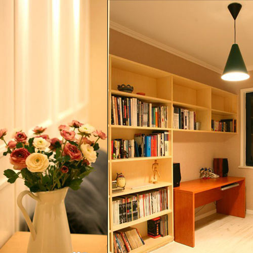 書房采用北歐風格的宜家吊燈,光源充足。一體化的實木書柜,便于取書置書,使閱讀更加方便。