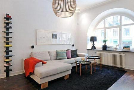 紅黑白時尚經典 亮點2:白色的墻面、沙發(fā)構成了整個空間純凈無暇的底色,半圓形的大窗戶為空間提供了良好的采光,使整個客廳明亮通透。大塊的黑色地毯與白色墻面形成鮮明的對比,使空間的層次感更加分明。并加上黑色小書架、臺燈等來作為呼應。紅色,就是畫龍點睛的一筆,一條紅色的披毯讓客廳有了視覺亮點。