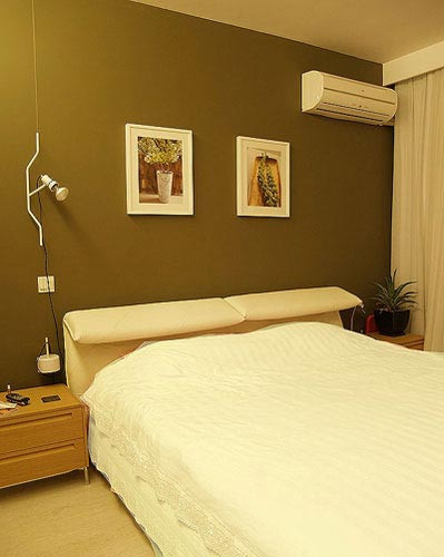 極致現(xiàn)代簡約家 亮點3:臥房的布置還是一如既往的簡約而有特色,沒有一點多余的裝飾,墨綠的床頭背景墻與植物宣告了主人崇尚自然的性格。
