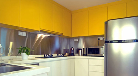 黃色的吊柜具有容易打動人的色感,暖色調(diào)的廚房透著一股親和力,帶來溫馨感覺,而白色的廚柜及金屬貼面的墻壁干凈整潔,為整體空間帶來寬闊感,讓多彩的熱力在整個廚房中蔓延開來,從此享受起有色的美食生活。