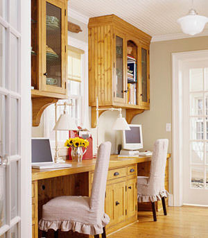 小戶里的工作間設(shè)計(jì) 如果你家中正好有個(gè)狹長(zhǎng)的玄關(guān)或走道,便可就此用來(lái)打造成雙人工作區(qū),保證了家庭成員可以同時(shí)使用,互不受影響。兩個(gè)工作臺(tái)連成一體,中間的壁柜能放置各種雜物。 |