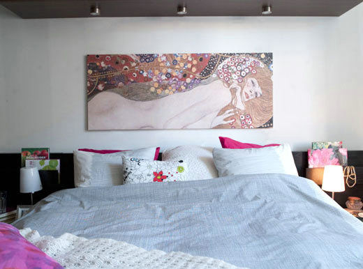 具有水彩色澤的床品,其清淡的底色,疊加上一抹艷麗的靠包,這些或純色,或帶有花案的裝點(diǎn),有效地配合和補(bǔ)充的床品,點(diǎn)綴和美化臥室空間。