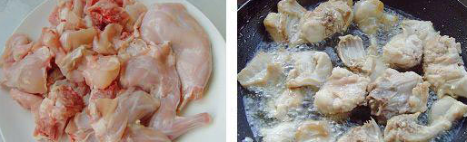 2、鍋置火上油燒熱,下入兔肉丁炸制,稍炒后改為中火。