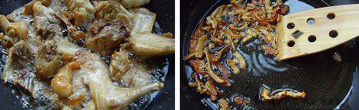 5、放入蔥姜、冰糖翻炒出香味后倒入兔肉,加適量熱水沒過肉塊即可。