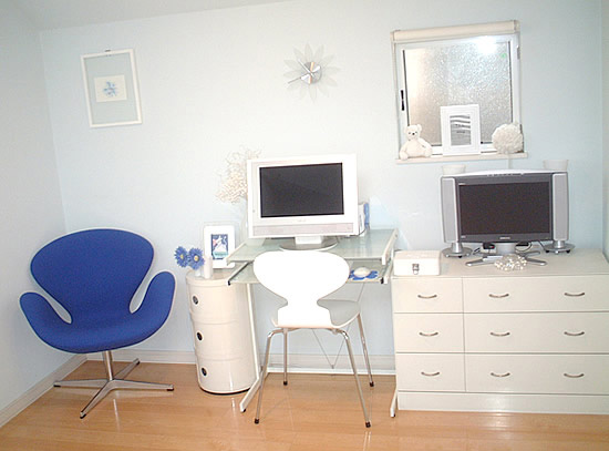 我的書(shū)房也是由藍(lán)色和白色構(gòu)成的。這個(gè)柜子和電腦桌都是我夢(mèng)寐以求的家具樣式,我非常滿意。其實(shí)這也是一家人的愿望,還有我們的兩只小狗,都很喜歡這樣的家居裝扮。
