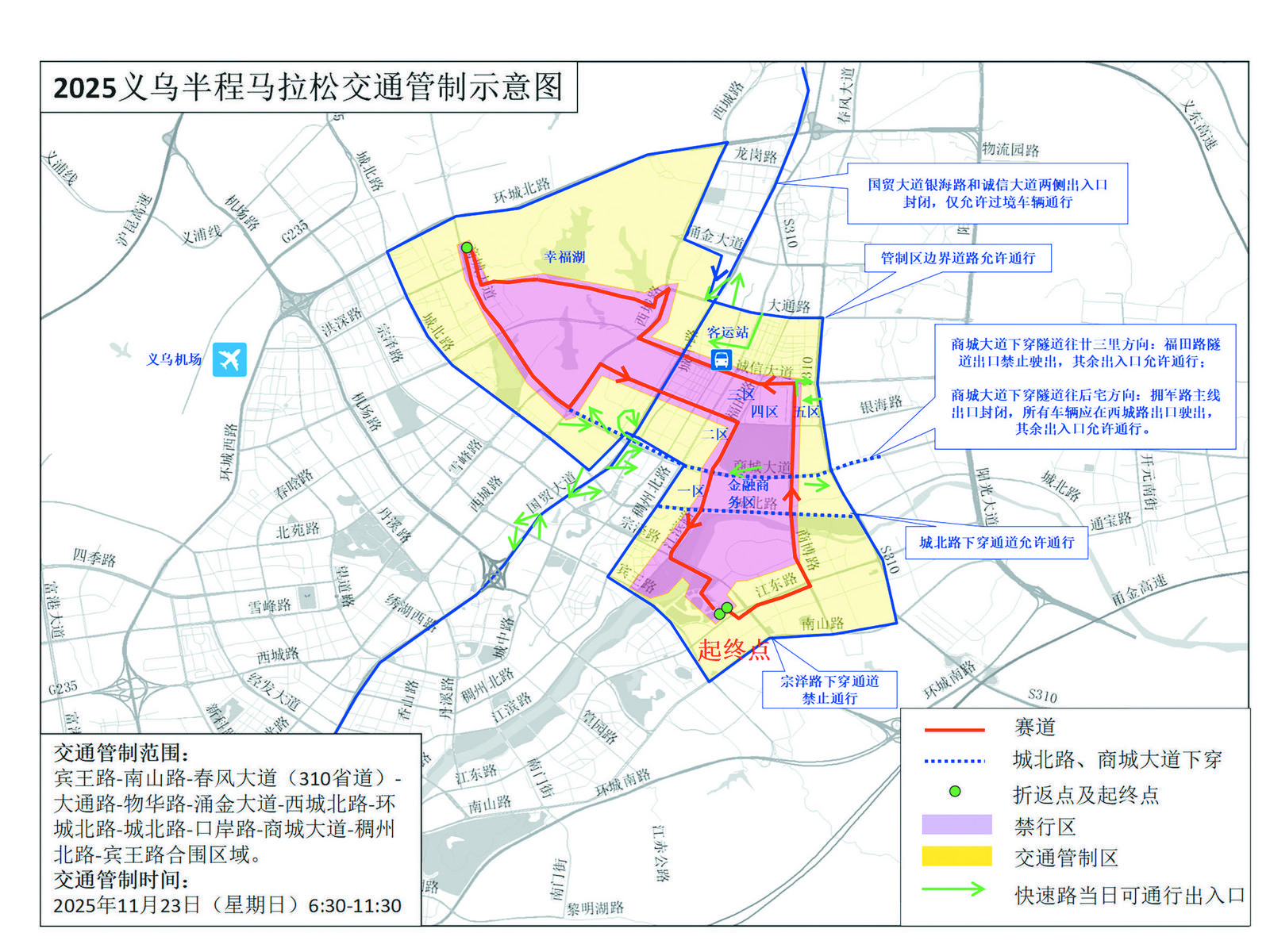2025義烏半程馬拉松將于11月23日(星期日)7:30舉行,屆時將有1萬余名運動員參賽,起終點設(shè)在梅湖體育中心游泳館前通道(即兩館路)。為確;顒禹樌M行,根據(jù)相關(guān)規(guī)定,公安機關(guān)交通管理部門將在比賽期間,對部分道路采取臨時交通管制措施。 據(jù)悉,半程馬拉松(21.0975公里):梅湖體育中心(起點)(左轉(zhuǎn))→江東東路(逆行)(左轉(zhuǎn))→商博路(順行)(左轉(zhuǎn))→誠信大道(順行)(右轉(zhuǎn)專用道右轉(zhuǎn))→西城北路(順行)(左轉(zhuǎn))→義烏植物園幸福湖濕地生態(tài)公園綠道→建設(shè)水庫水壩大道→幸福水庫水壩大道(全幅)→大通路(順行)(右轉(zhuǎn))→商城大道(半幅順行,逆時針折返后)→商城大道(逆行)(左轉(zhuǎn))→西城北路(順行)(右轉(zhuǎn)專用道右轉(zhuǎn))→銀海路(順行)(右轉(zhuǎn))→福田路(順行)→江濱北路(順行)(左轉(zhuǎn))→宗澤大橋(順行)(右轉(zhuǎn))→清波路(全幅)(左轉(zhuǎn))→梅湖體育中心(終點)。 根據(jù)比賽進程和線路設(shè)置情況,對相關(guān)道路實施臨時封閉、分段開放、禁止停車等相關(guān)交通管理措施。 11月22日(星期六)22:00起至比賽結(jié)束,上述賽道路段及梅湖體育中心(賓王路—清波路—下王路—江東東路—賓王路合圍區(qū)域)禁止車輛進入、停放,公安機關(guān)交通管理部門將對區(qū)域內(nèi)的停放車輛進行清理。 11月23日(星期日)6:30至11:30,對賓王路—南山路—春風大道(310省道)—大通路—物華路—涌金大道—西城北路—環(huán)城北路—城北路—口岸路—商城大道—稠州北路—賓王路合圍區(qū)域(不含以上道路)進行臨時交通管制。除持有通行證車輛外,其余車輛禁止進入。 為盡量降低賽事對城區(qū)交通的影響,在比賽隊伍未到達前,賽道沿線設(shè)置了15處交通穿越點,允許車輛、行人在現(xiàn)場執(zhí)勤人員的組織下有序穿越賽道,但禁止進入賽道內(nèi)通行。 6:45前,江東東路與下王路路口、商博路與清波路路口允許車輛和行人穿越賽道;7:25前,僅允許非機動車和行人穿越賽道。 7:35前,商博路與商城大道路口、商城大道與福田路路口、商博路與銀海路路口允許車輛和行人穿越賽道。 7:40前,誠信大道與稠州北路路口、誠信大道與工人北路路口允許車輛和行人穿越賽道,誠信大道與商博路路口允許非機動車和行人穿越,但禁止機動車穿越賽道。 8:00前,商城大道與柳青路路口允許車輛和行人穿越賽道,商城大道與擁軍路路口、商城大道與雪峰路路口允許非機動車和行人穿越,但禁止機動車穿越賽道。 8:15前,銀海路與城中北路路口、銀海路與工人北路路口、銀海路與稠州北路路口允許車輛和行人穿越賽道。 8:20前,城北路與福田路路口允許車輛和行人穿越賽道。 為減少影響,將根據(jù)賽事進度,實行分段解除交通管制,恢復交通措施。 賽事期間,公安機關(guān)交通管理部門將視賽事、交通的實際情況對交通管制時間進行適當調(diào)整,請行經(jīng)比賽沿線及外圍管控區(qū)域的車輛和行人服從現(xiàn)場交警和工作人員指揮。賽事期間交通管控區(qū)域廣、時間長,請賽道沿線單位人員和小區(qū)居民及時關(guān)注公安機關(guān)交通管理部門發(fā)布的信息,提前安排好出行線路,出行過程中關(guān)注導航地圖發(fā)布的道路交通信息。 此外,為確保賽事順利舉行,特制定賽事停車指南:賽道及賽道兩側(cè)嚴禁停車。起終點周邊停車位緊張,請參賽運動員盡量選擇公交車、共享電單車、自行車等交通工具,或拼車、打車前往參加比賽。參賽運動員如確需駕駛車輛前往,請將車輛停放在行政三號樓、行政四號樓、行政七號樓、五愛新村東北側(cè)停車場、勘測院南側(cè)停車場、新城吾悅廣場地下停車場、江濱綠廊停車場、凱信酒店停車場、圖書館檔案館停車場以及國際博覽中心停車場(其中兩館停車場、國際博覽中心停車場僅允許社會車輛在11月23日6:45前,通過江東東路與下王路路口、清波路與商博路路口進入)等區(qū)域。梅湖體育中心區(qū)域內(nèi)禁止自駕車輛進入,請服從交警和現(xiàn)場工作人員指揮。 |