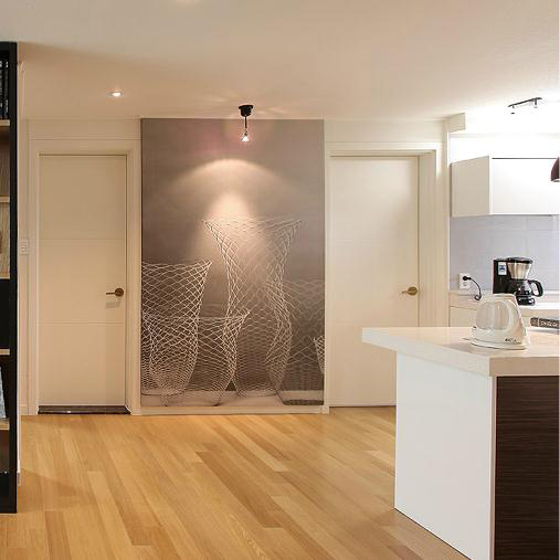 編輯點評:鋼絲花紋的壁紙,在淡黃射燈的映襯下,是不是會有點弄假成真呢?用灰色背景的壁紙隔開大塊純白色的色塊,不僅能讓家居的顏色層次更豐富,還能起到分開廚房和客廳的作用。