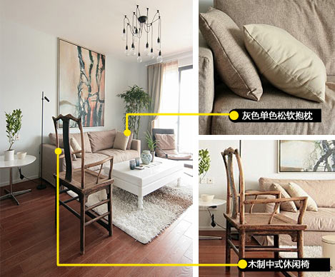 客廳 元素:灰色松軟抱枕+木制中式休閑椅 搭配點評:這個客廳給人一種古典的味道,設計風格是簡約風,由于配置的家具呈中式風格,從而有那么一種古典美。