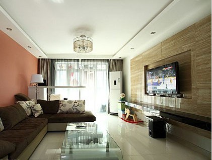電視背景墻用棕色木紋墻磚打造而成,并在中間為電視機開了個槽,讓墻面的整體性更強。白色加玻璃的時尚小茶幾搭配轉(zhuǎn)角沙發(fā)顯得恰到好處。
