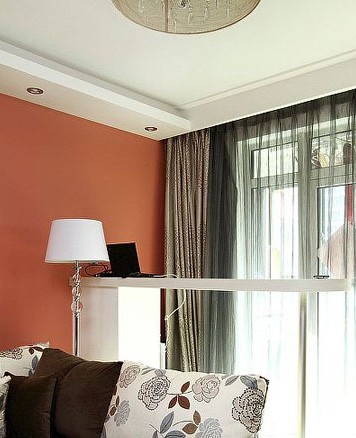 胭脂紅的沙發(fā)背景墻在棕色、白色、黑色的搭配中顯得格外亮麗,不僅為空間增添了一抹溫馨甜美的色彩,同時(shí)與其他色彩的搭配也顯得相得益彰。