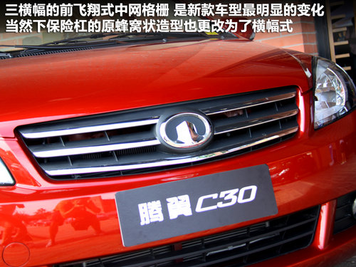 外觀方面,2012款騰翼C30主要變化集中在了前格柵,之前的中網(wǎng)造型修改成了三欄式鍍鉻橫條造型,視覺效果更加簡潔大氣。車身包圍同時也進(jìn)行了更新。