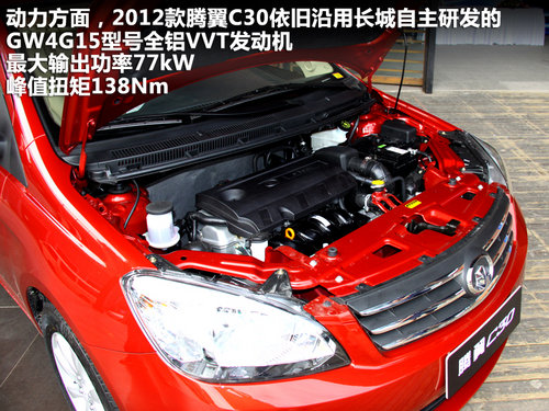 動力方面,2012款騰翼C30依舊沿用長城自主研發(fā)的GW4G15型號全鋁VVT發(fā)動機(jī) ,其最大輸出功率77kW/6000rpm,峰值扭矩138Nm/4200rpm,配備5擋手動和CVT 變速器。